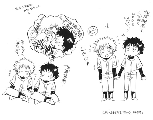 で、問題は来月どのへんの話をやる気なのかということです。埼玉からはどこが甲子園に行くのか。来年の下見と称して阿部と三橋が2人で甲子園見に旅に出る編とかどうよ。婚前旅行。まあ阿部の足がアレなんで阿部家総出でいらしても可。部屋は2人にしてくれえ。笑。
