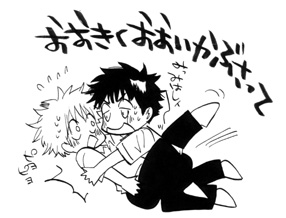 私はすごい軽いノリで描いてください〜って言ったのですが、木山さんは大変苦労されたらしく、今回載せさせてもらった絵は難産の末生まれたアベミハでございます。「アベミハ、難しいです!」とのこと。それはひぐち先生絵が難しいですか?阿部と三橋という存在が難しいですか?笑。そういうのは個人的に聞け!笑。あとお手紙で「三橋&阿部(しまった逆だった!)」って書いてあったのがおもろかったです。気を遣わせまして。どっちでもいいですよ〜にやにや。