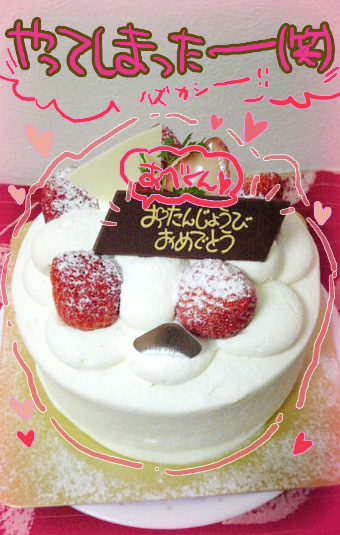 うわー…やっちゃったよ…(笑)。違うのん…普通にケーキ買おうと思っただけなんだ…そしたら店員さんが「お誕生日ですか?」って聞くから「はい」って言うたらこんなメッセージチョコつけてくれた…。おたんじょうび、の「お」がハートになっとるでってお母んに言われた…。愛だな…うん(笑)。
