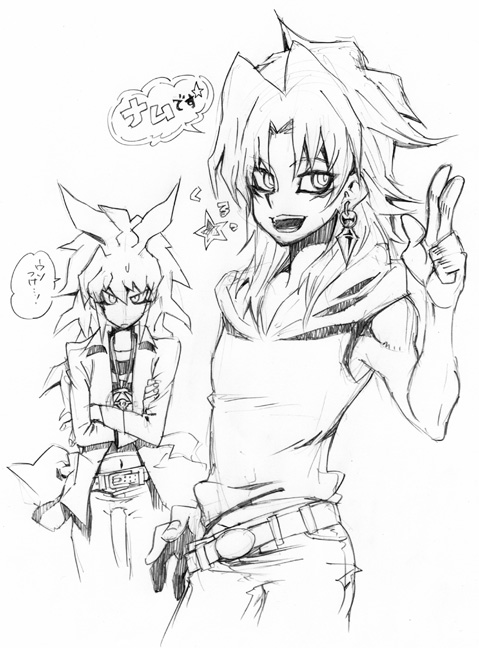 マリクってどうも3人居るような感じがしてならない。というのは表マリクの人格の振り幅広くないか?遊戯に復讐心を燃やす表マリク(バトルシティで遊戯と人形を介してたたかうときとか)自分自身を滅ぼしてもいい表マリク(バクラのなかに入ってたマリク、遊戯との最終戦で生け贄になったとき等)ってな感じで。で一番明るい(前向きな)ときのマリクを私は勝手にナムと呼んでいる。だからこの絵はナムである。バクラはイケメン作画監督として有名だそうな、平山先生の髪の描き方をリスペクトしていきたい。やっぱバクラとマリク描き易い〜〜〜!笑、大好き!