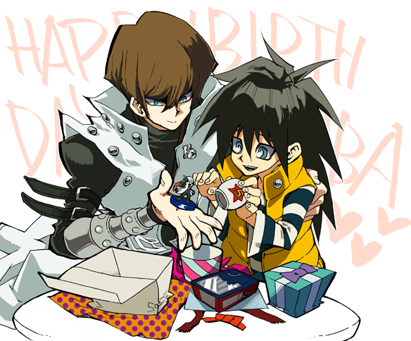 小さいのでよく分からないかもしれませんが、海馬が手にしているのはカプセルモンスターのカイバーマンヴァージョンです。兄がモクバのために特別に作った…という設定。はじめブルーアイズにしようかと思ったんだけど、ブルーアイズ好きなのは海馬であってモクバじゃないわけで、一応そこは理解していたらしく、モクバの好きなモノ、カプモンとそして自分自身をあげるよ的な傲慢な発想です笑。しかしそれでこそ兄!笑。