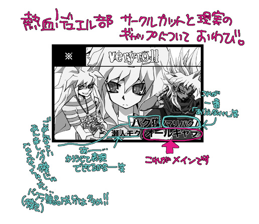 当初、ほんとに獏良しか描かないんじゃないかというくらい、サークル活動の展望が獏良一色だったので、そのようにサークル概要を描きまして…。ふたを開けてみたらすいません、完全にオールキャラでした。獏良は大好きだから、オールキャラ本の中でもわりといっぱい描いてるほうです。獏良もバクラもおんなじくらい描いたかな。だから獏とバクのからみがなくても好きだよという方にはわりと楽しいサークルだと思います。ただ、全然BL臭は無い!と先に行っておきます。カップリング表記したのにすいません…!