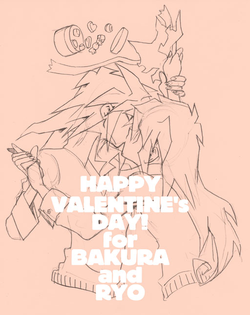 サイトを持ったら一度はやってみたいと思っていた「1日限定仕様」をやってきました。バレンタインはカップリング趣向にはうってつけの日なのでイメージも湧きやすく、企画自体は楽勝でしたが実際やるのは大変めんどくさかったです笑。で、以下は一日限定拍手お礼絵にあげていた闇バクラ×宿主絵です。
