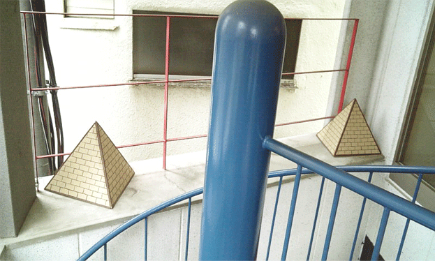 なんかピラミッドの置物がおいてあった。真ん中に写ってる青いもんは螺旋階段の柱。
