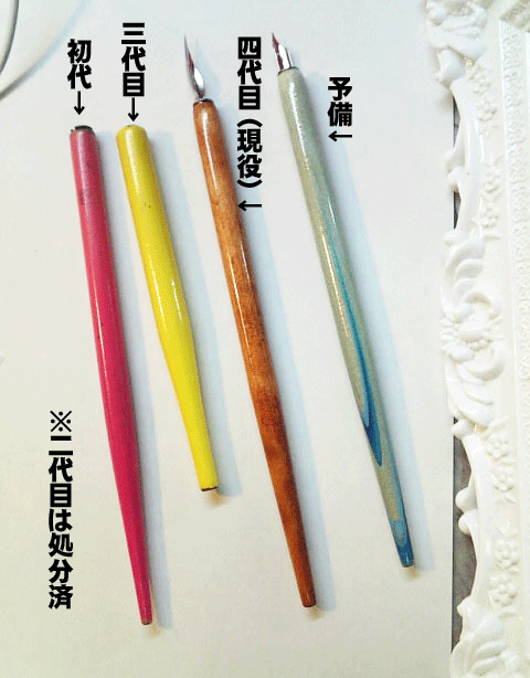 ペン先を水で洗うときによく軸の方まで水につけすぎてダメにしてしまう。初代ペン軸はショッキングピンクのペン軸だった。これがすこぶるお気に入りだった。書き味ではない。色が笑。文具屋さんに置いてるペン軸は色がいまいちで気に入らないと思っていたのだが、おしゃれ文具の店でこれを見つけて即購入。予備を買っておけばと大いに後悔した。結構形から入るタイプである。文具の色が気に入らないと楽しくない。このお気に入りだった初代ペン軸は、やはりペン先を洗うときに軸の中まで水につけてしまいダメにした。ペン先を固定する金具のところがさびてしまったのだ。今思っても残念。意味も無く未だ捨てずに置いている笑。