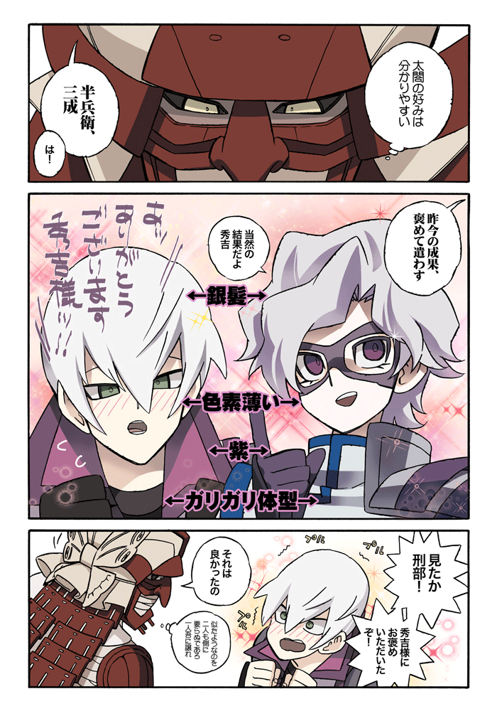や、三成と半兵衛って色合いが似てるなって思って。あの二人を重宝するのは秀吉の個人的趣味なんじゃねーのか!というつっこみをしたくて。刑部はなんでも呪いで解決しようとするのが悪いクセである笑。