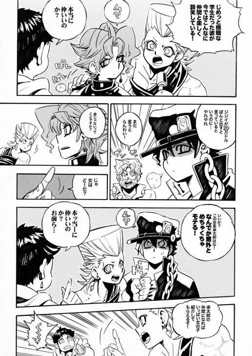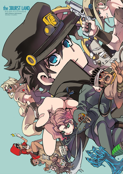 今回はオールキャラ本です。表紙はもっと全体が斜めの構図になる予定だったのですが、すっかりB4サイズで縦状態(昨日の記事を合わせてご覧くださいませ)、それを強引に表紙&裏表紙にしてるという笑。オールキャラ本のときは、表紙に5人全員入るようにしなければとずっと思ってこれまで描いていたのですが、もういいかと思って今回はポルナレフに裏に回ってもらった。そして裏なので好き放題していいだろうと思い、顔面シャンプーぶっかけ&舌だし&両手両足縛られ(たときのコードの形跡)状態!笑。いやあ、鬼楽しかったです笑。それより誤算は実は本文中にアヴドゥルの出番が極端に少ないこと!アヴドゥル好きな方にはすいませんです。ポルナレフと花京院率高いです。二人のかけあいというか、仲直りの肘鉄したり、ピシガシグッグするノリが好きな方にはツボが近い内容です。
