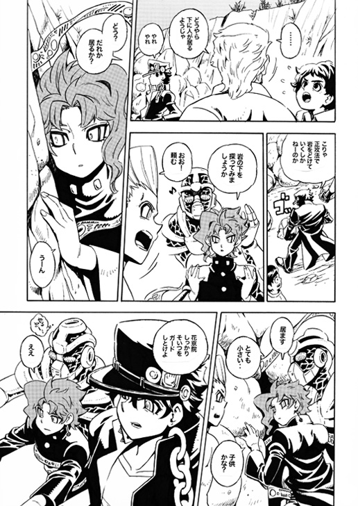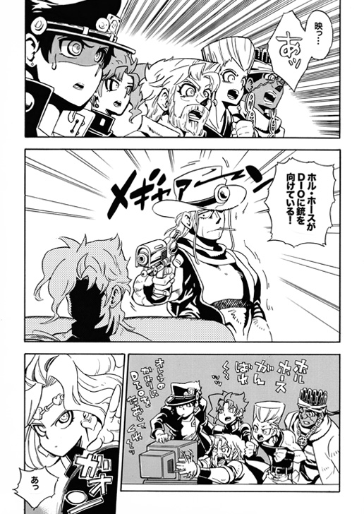 ディオの館を念視するのに一生懸命になったりするギャグ。承太郎、花京院、ジョセフ、ポルナレフ、アヴドゥルがまんべんなく出ます。