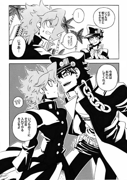 「今描いてるキャラが一番可愛い」の法則というのがあります。GB10で出したオールキャラ本のときはポルナレフ率高かったのでポルナレフが可愛くって仕方なかったです。で、承花本作業始めて、まああ承太郎の可愛いこと可愛いこと笑。承太郎かわええ~~~と思いながら描きました。や、そら、承太郎は基本「腹立つほどかっこいい」ですよ笑。でもカップリングとして描くときはちょっとね、可愛い所もあるのねっていうのを描きたいのよ笑。