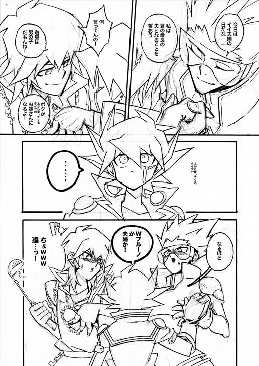 今回は私の本にしてはめずらしくゲストがおります。いやあ…さすがるいちゃんの絵は政宗って感じだ!!!!笑。これぞ真打ち!という感じの政宗様のイラストをいただきましたので是非ご覧いただきたいです。実はまだあんまり小政の同人誌は持ってなくって、ジャンル自体の傾向が全然分かってない状態です。そんななかでるいちゃんと絵チャしたりイラスト見せてもらってたりして、おお!これぞ政宗!と思ったので私も今回はシュッと描くぞ~~~と自分なりに(自分なりに)シュッとした画風を目指したんです。それがダメでした笑。描けども描けども頭ん中にある政宗が紙の上に出てこないわけです。下書きも何度も何度も消してリライトして笑。メインの子が全く描けないってこらぁヤバいな!と。なんとか半分くらい下書き済んだ状態で、ちょっと気分転換にと描いた遊戯王の遊星君に「ああ!こいつなんて描きやすいのか!」と笑。そんで以降、政宗の顔(直せる範囲で)全部遊星に直したった笑。したら自分の同人誌!って感じになったんよなあ笑。やっぱ『シュッと絵』は無理だな!笑。最終的にはショタ癖が全面に出て「もうこれは政宗なのか?」というところまで行っている…かもしれない…。政宗様がちっちゃい可愛いでもいい方は是非、ということで!