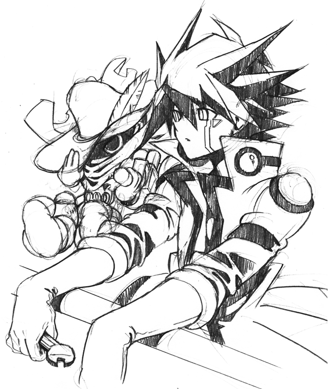 以下はこないだまでサイトで拍手絵に使っていた遊星です。遊戯はブラマジやクリボーと、十代はハネクリボーとのイラストが多くあるのに、遊星はそういういつも一緒モンスターがあんまない気がして。ジャンクシンクロン君を召喚してみました。私はこれすごい気に入ってるんですがどうでしょうか笑。