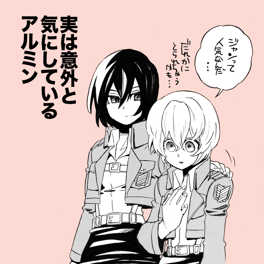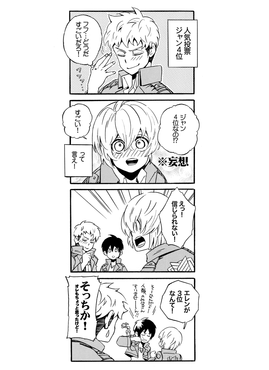 私はジャンアルですが、なんでかジャンがミカサのこと好きでもわりと平気です。なんでか、というか、あえて根拠らしきものをあげるなら、ジャンは絶対にアルミンのこと意識している、とか、もうジャンの人生はアルミンを無視しては語れない、と私は謎の自信をもっているから、ということになるでしょうか。妙な余裕がある笑。他のジャンルだとそうはいきません。好きな攻めキャラが他の女の子キャラとくっつくのが正直しんどかった作品はいっぱいあります。あ、ミカサがジャンのこと好きになる可能性は0だと思ってるから、ってのもあるか笑。残酷である。笑。