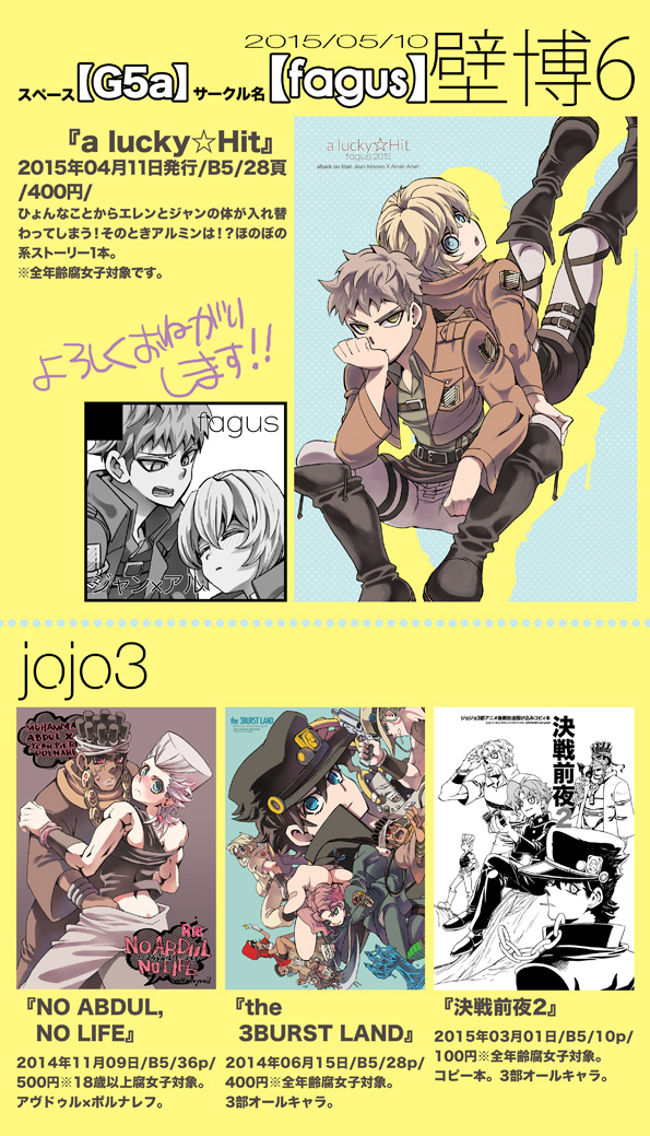 お隣のスペースの方と少しだけお話ができました!ジョジョの!笑。お隣の売り子さんがジョジョ好きの方でジョジョの話できて嬉しかったです。アヴポル本なかなかないですよね!が共感出来るってなんとありがたいことか!!!!私の有り余るジャンアルはそれほど進撃熱心でもない友人に受け止めてもらいました笑。今日もイイのをいただきましたよ「夏野はアルミンオンリー行かなあかんやろ!」なるほど、みんな思うんだな。あったら行っとるわい笑。